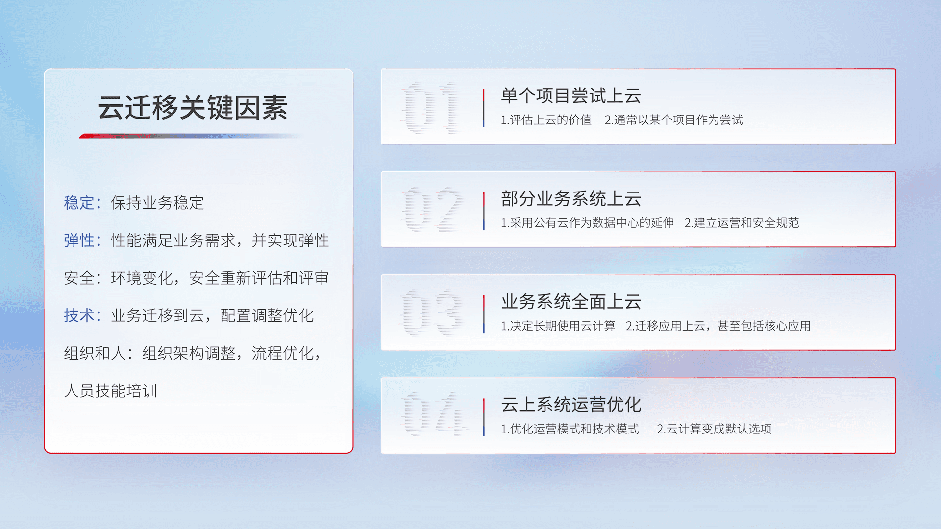结合实际业务,,,从规划设计、、、、云平台选型、、云原生改造、、、数据迁移、、集成交付,,,迁移全过程为客户识别最佳上云路径,,做好风险识别管理,,,设计网络架构、、、身份权限、、、、安全审计合规、、、操作审计、、日志审计、、、、监控告警策略、、多站点容灾设计等,,对云上基础设施进行整体规划,,,提升IT治理水平,,,以满足弹性、、高可用、、、、高性能的需求。。。